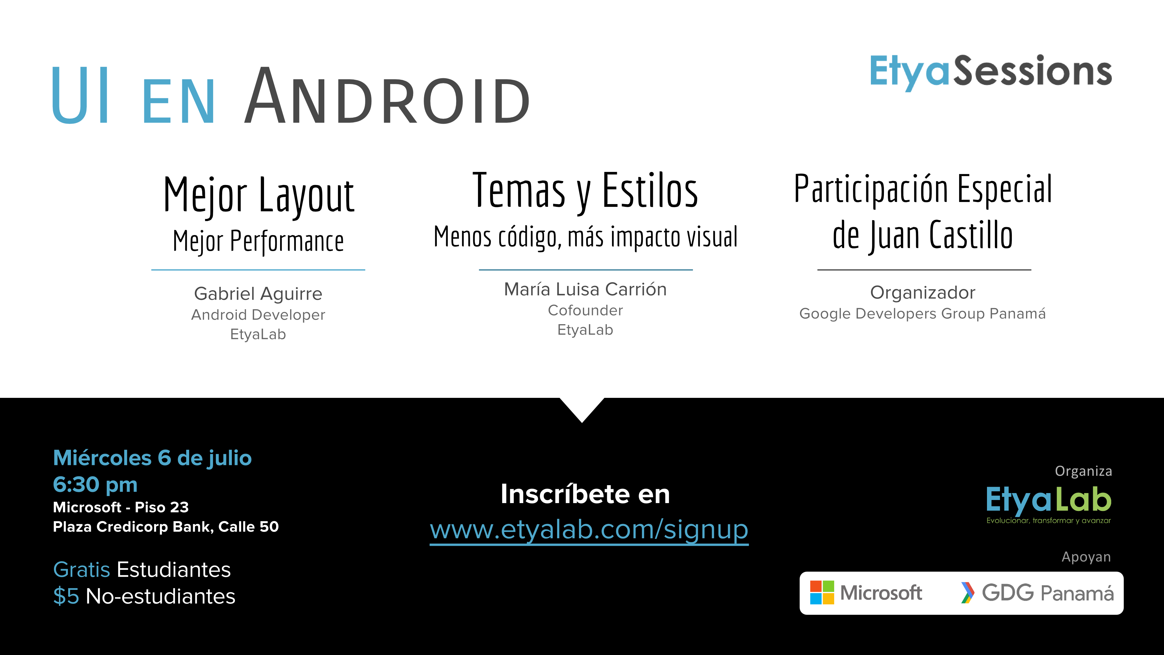 La primera sesión será sobre el desarrollo de la interfaz en Android. Como expositor es tendremos a dos desarrolladores de EtyaLab, que conversarán sobre layouts, estilos y temas en Android y de Material Design.